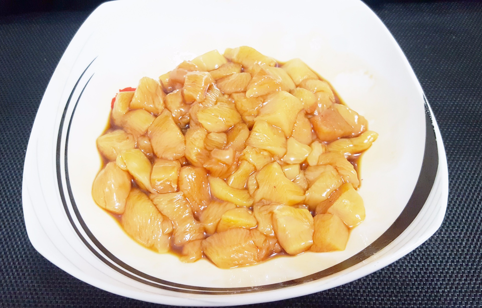 un bol, le añadimos la salsa de soja, tapamos con papel film y reservamos en la