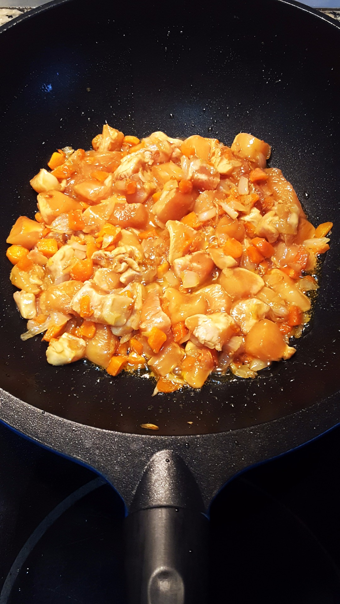 A continuación, en un wok o sartén profunda, añadimos un chorrito de aceite de oliva y pochamos las verduras, unos 10 min. Pasado este tiempo escurrimos un poco de la salsa sobrante del pollo y lo incorporamos con las verduras, cocinamos 10 min más.